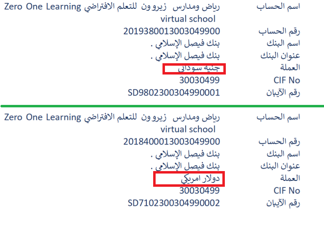 3) ✅ الدفع عن طريق الحوالة البنكية: يرجى دفع الرسوم المطلوبة لبيانات الحوالة التالية مع مراعاة رسوم فرق الحوالة ويجب ذكر اسم التلميذ والرقم الخاص به في تعليمات الإيداع / التحويل و ارسال قسيمة الإيداع أوالتحويل عبر الواتساب الي الرقم التالي00249912257517 أو 00249912131210 أو عبر بالبريد الإلكتروني إلى info@zol.edu.sd