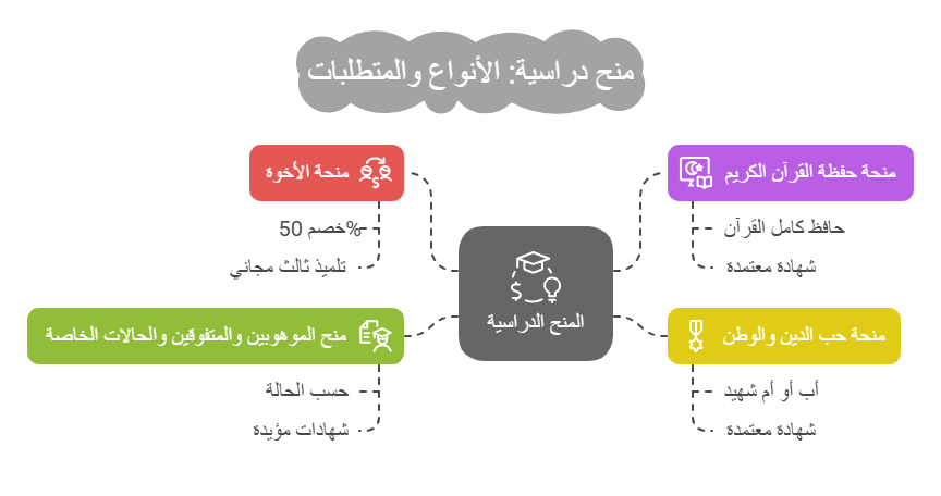 3) منحة حب الدين والوطن: كل من له أب أو أم أو شقيق أو شقيقة سقط شهيداً في حرب بلدنا الأخيرة يعفي من الرسوم الدراسية بعد ارفاق الشهادة المؤيده والمعتمدة من الجهات المتخصصة لذلك.
