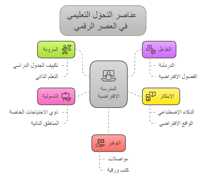 نمتلك عناصر التحوّل التعليمي في العصر الرقمي في رِيَاضُ وَمَدَارِسُ زِيْرُو وَنْ لِلْتَعَلُّمِ الافْتِرَاضِي (ZOL) علي النحو التالي: