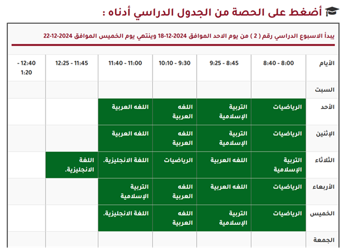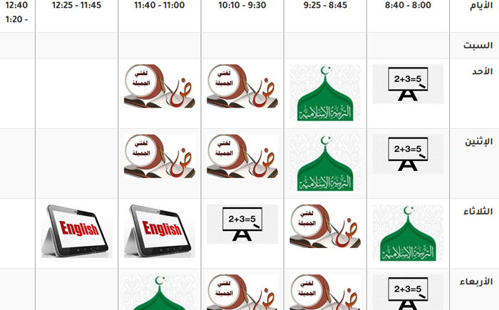 كما ستكون هناك متابعة دورية من قبل المعلّم أو الموجه الرقمي بطريقة جديدة متطورة وغير تقليدية ، نقدم جداول دراسية تحاكي الجداول الدراسية التقليدية في طريقة عرضها فقط، مثلا : الجدول الدراسي للصف الاول