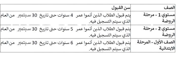 يبين الجدول التالي سن القبول في رِيَاضُ وَمَدَارِسُ زِيْرُو وَنْ لِلْتَعَلُّمِ الافْتِرَاضِي (ZOL)